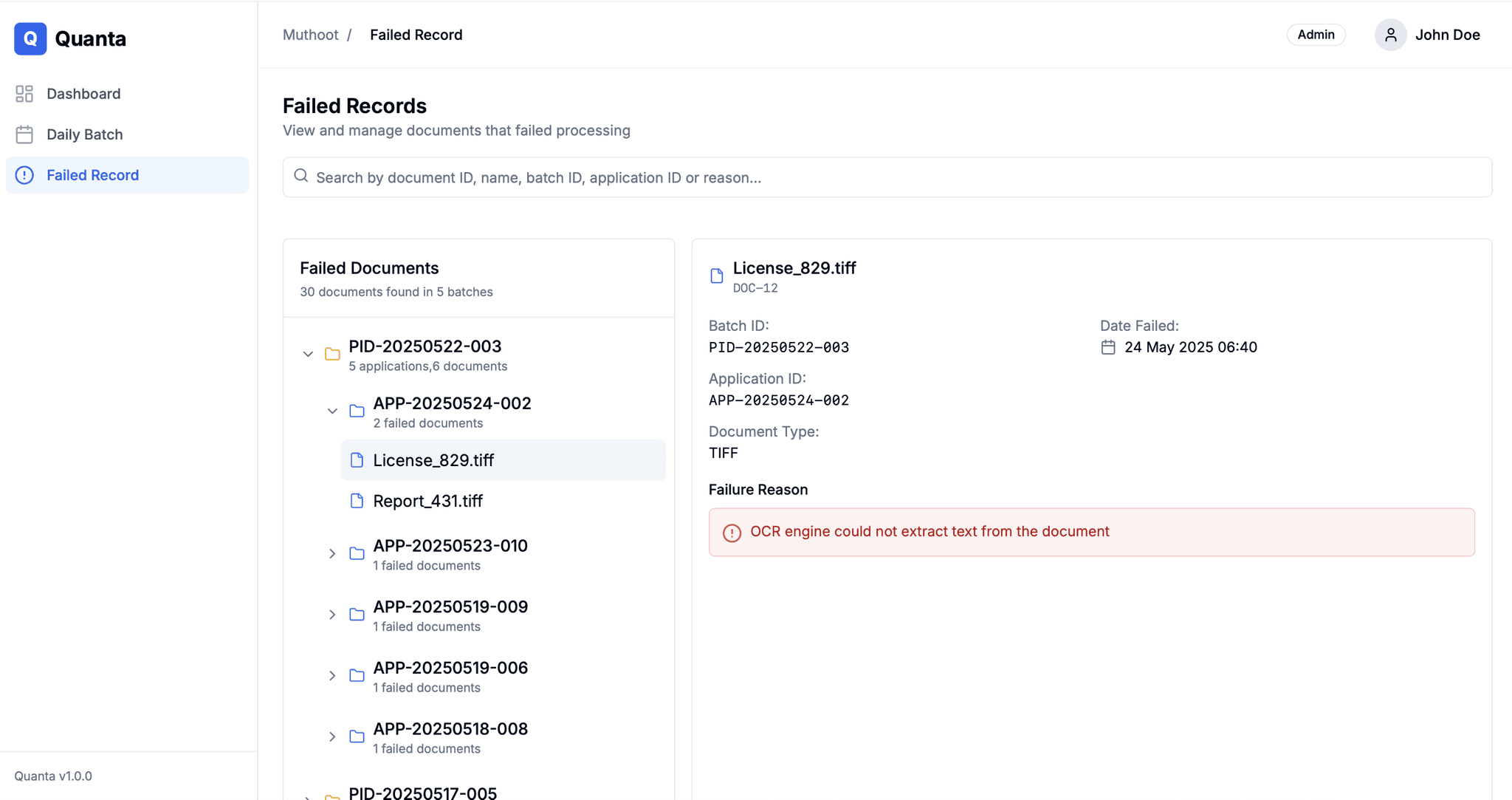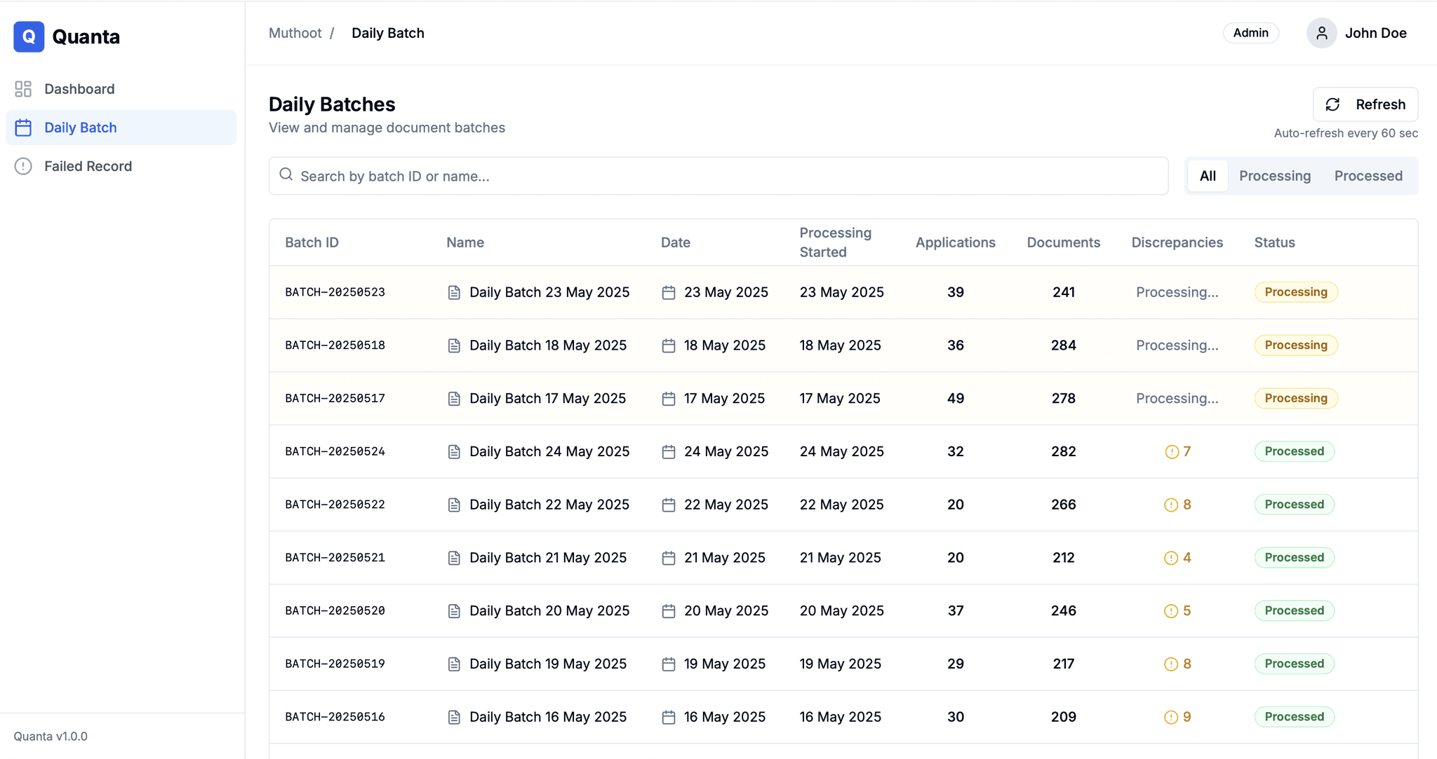 The manual CKYC verification process at Muthoot Capital was time-consuming, error-prone, and dependent on human operators. Admins had limited visibility into the progress or status of batch uploads and struggled with resolving failures efficiently. This created operational bottlenecks, delayed loan disbursements, and increased costs.